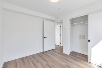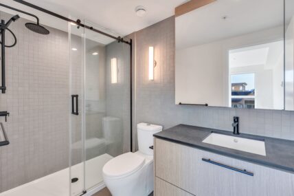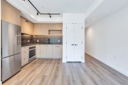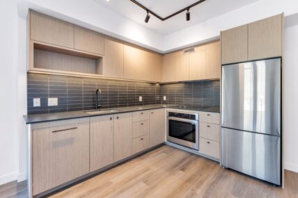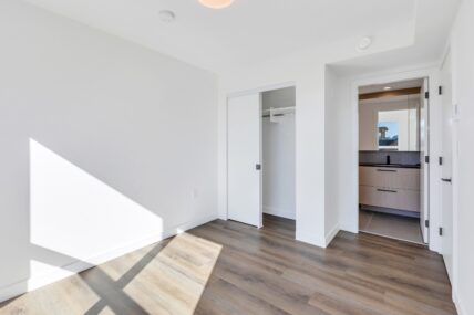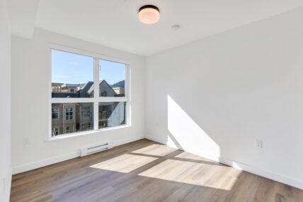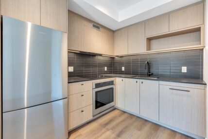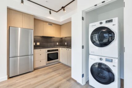Choose from spacious one-, two-, and three-bedroom suites, each featuring contemporary kitchens with Caesarstone countertops, matte black hardware, stainless steel appliances, and in-suite washers and dryers. Durable vinyl plank flooring and private patios or terraces complete the homes—perfect for unwinding or entertaining.