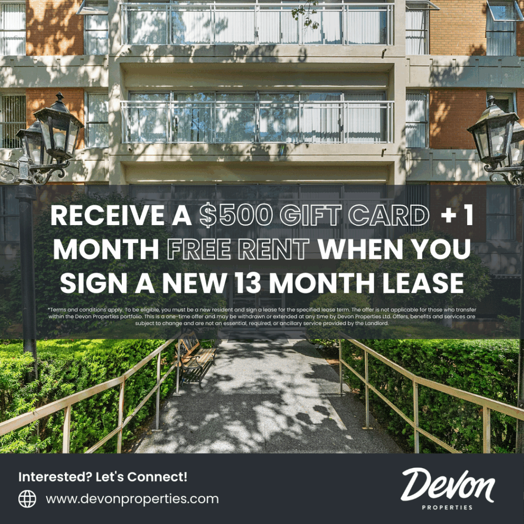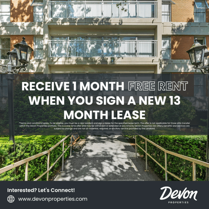 *Terms and conditions apply. To be eligible, you must be a new resident and sign a lease for the specified lease term. The offer is not applicable for those who transfer within the Devon Properties portfolio. This is a one-time offer and may be withdrawn or extended at any time by Devon Properties Ltd. Offers, benefits and services are subject to change and are not an essential, required, or ancillary service provided by the landlord.