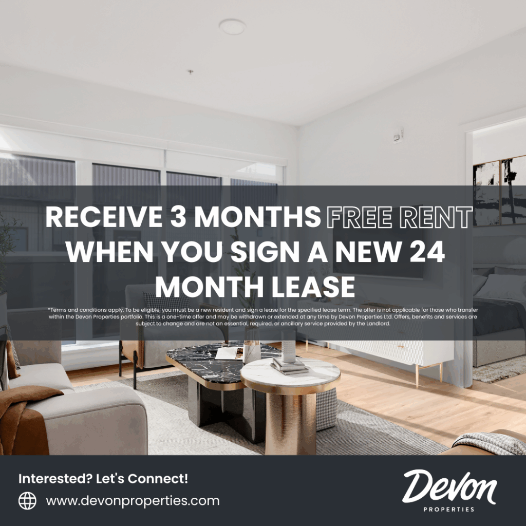 *Terms and conditions apply. To be eligible, you must be a new resident and sign a lease for the specified lease term. The offer is not applicable for those who transfer within the Devon Properties portfolio. This is a one-time offer and may be withdrawn or extended at any time by Devon Properties Ltd. Offers, benefits and services are subject to change and are not an essential, required, or ancillary service provided by the landlord.