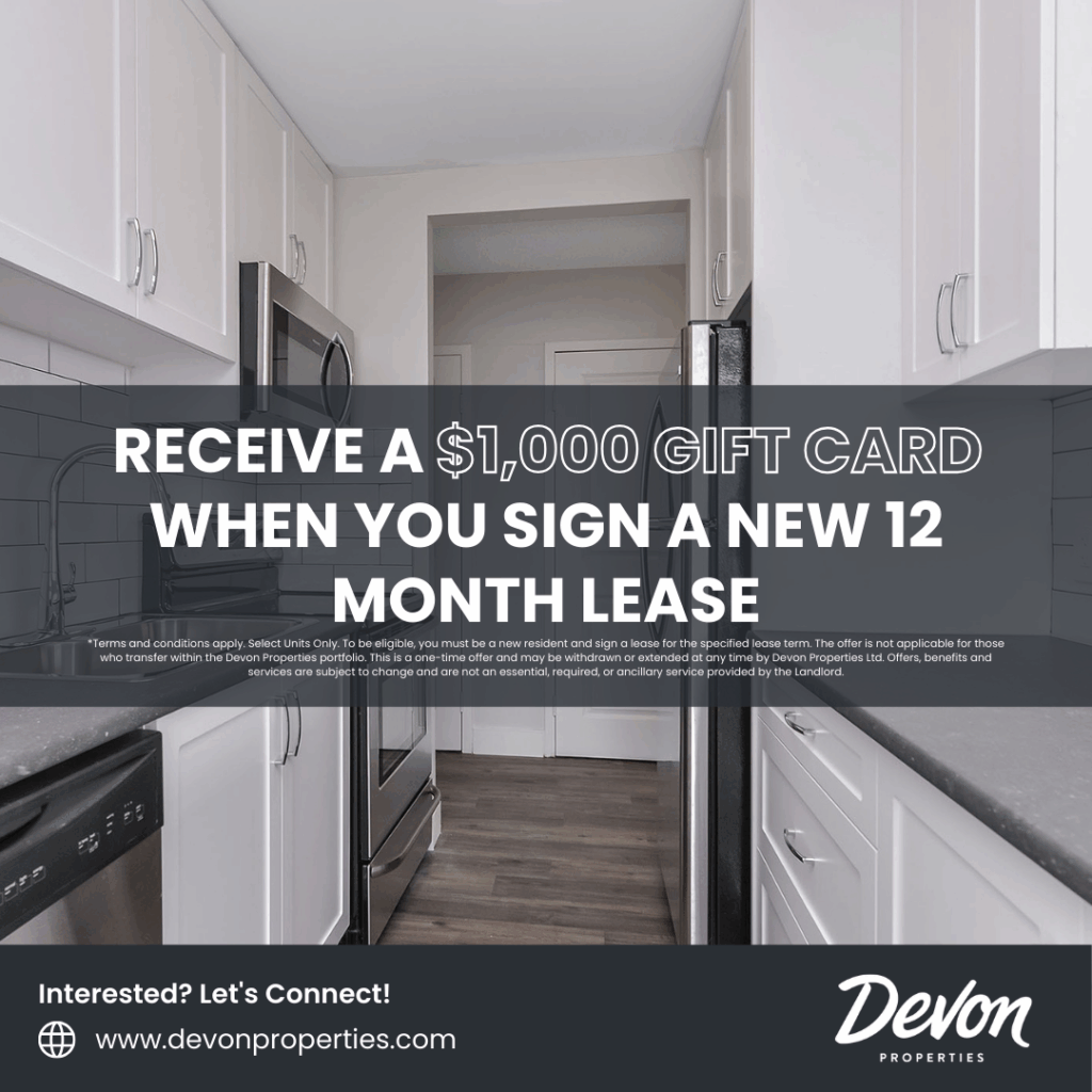 *Terms and conditions apply. To be eligible, you must be a new resident and sign a lease for the specified lease term. The offer is not applicable for those who transfer within the Devon Properties portfolio. This is a one-time offer and may be withdrawn or extended at any time by Devon Properties Ltd. Offers, benefits and services are subject to change and are not an essential, required, or ancillary service provided by the landlord.