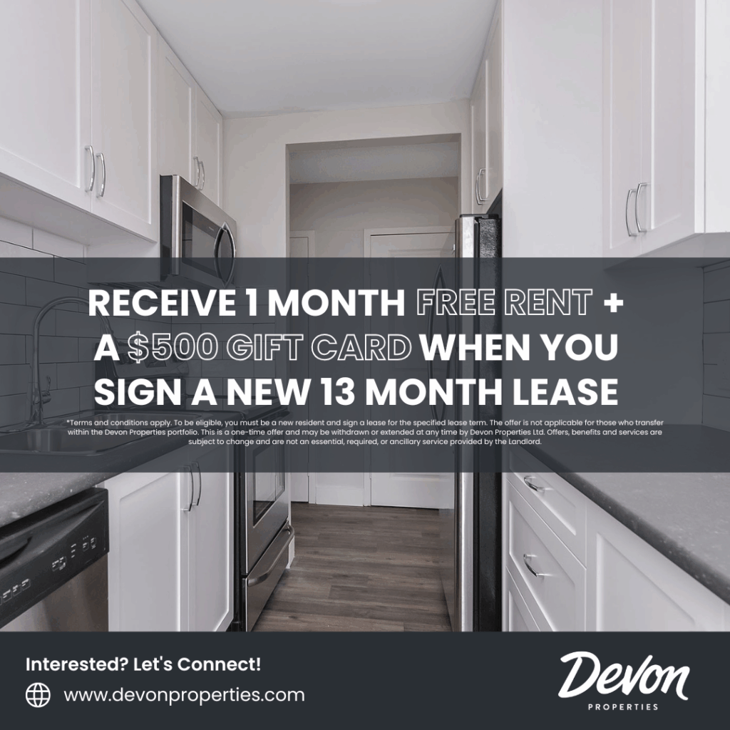 *Terms and conditions apply. To be eligible, you must be a new resident and sign a lease for the specified lease term. The offer is not applicable for those who transfer within the Devon Properties portfolio. This is a one-time offer and may be withdrawn or extended at any time by Devon Properties Ltd. Offers, benefits and services are subject to change and are not an essential, required, or ancillary service provided by the landlord.