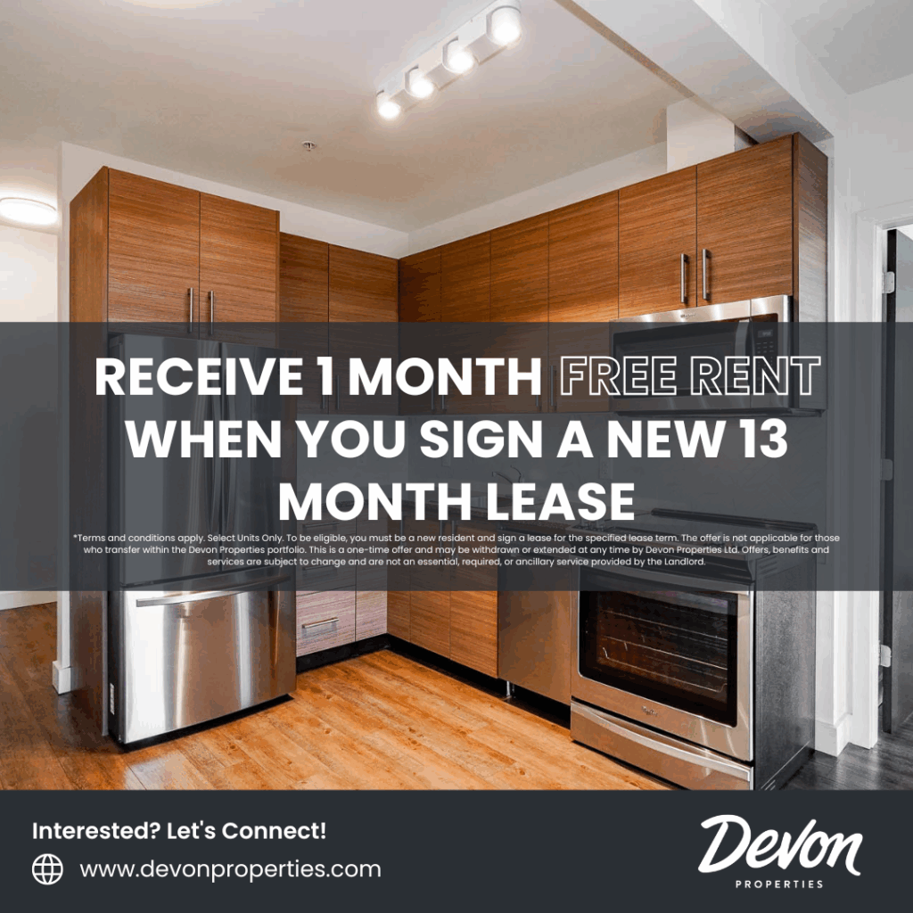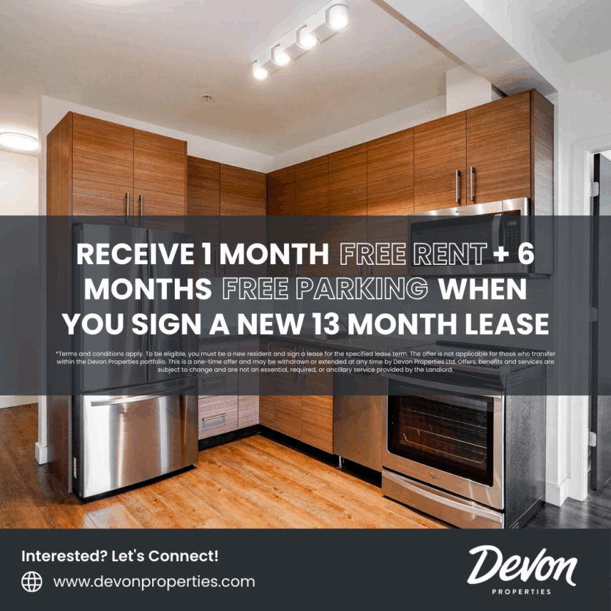 *Terms and conditions apply. To be eligible, you must be a new resident and sign a lease for the specified lease term. The offer is not applicable for those who transfer within the Devon Properties portfolio. This is a one-time offer and may be withdrawn or extended at any time by Devon Properties Ltd. Offers, benefits and services are subject to change and are not an essential, required, or ancillary service provided by the landlord.