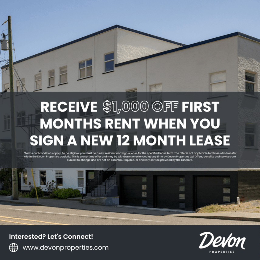 *Terms and conditions apply. To be eligible, you must be a new resident and sign a lease for the specified lease term. The offer is not applicable for those who transfer within the Devon Properties portfolio. This is a one-time offer and may be withdrawn or extended at any time by Devon Properties Ltd. Offers, benefits and services are subject to change and are not an essential, required, or ancillary service provided by the landlord.