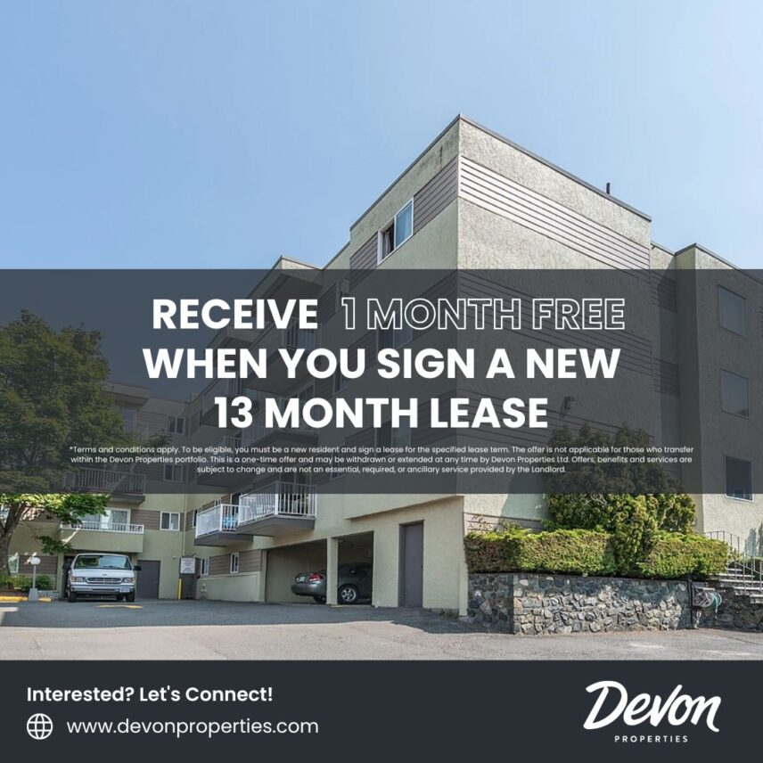 *Terms and conditions apply. To be eligible, you must be a new resident and sign a lease for the specified lease term. The offer is not applicable for those who transfer within the Devon Properties portfolio. This is a one-time offer and may be withdrawn or extended at any time by Devon Properties Ltd. Offers, benefits and services are subject to change and are not an essential, required, or ancillary service provided by the landlord.