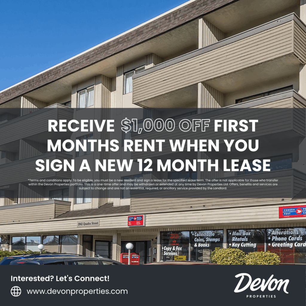 *Terms and conditions apply. To be eligible, you must be a new resident and sign a lease for the specified lease term. The offer is not applicable for those who transfer within the Devon Properties portfolio. This is a one-time offer and may be withdrawn or extended at any time by Devon Properties Ltd. Offers, benefits and services are subject to change and are not an essential, required, or ancillary service provided by the landlord.