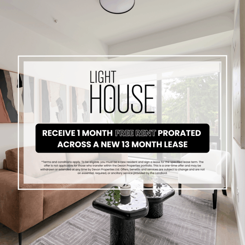 *Terms and conditions apply. To be eligible, you must be a new resident and sign a lease for the specified lease term. The offer is not applicable for those who transfer within the Devon Properties portfolio. This is a one-time offer and may be withdrawn or extended at any time by Devon Properties Ltd. Offers, benefits and services are subject to change and are not an essential, required, or ancillary service provided by the landlord.
