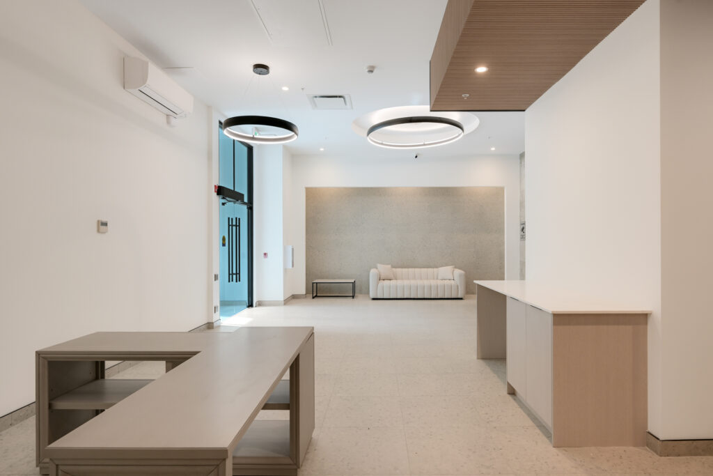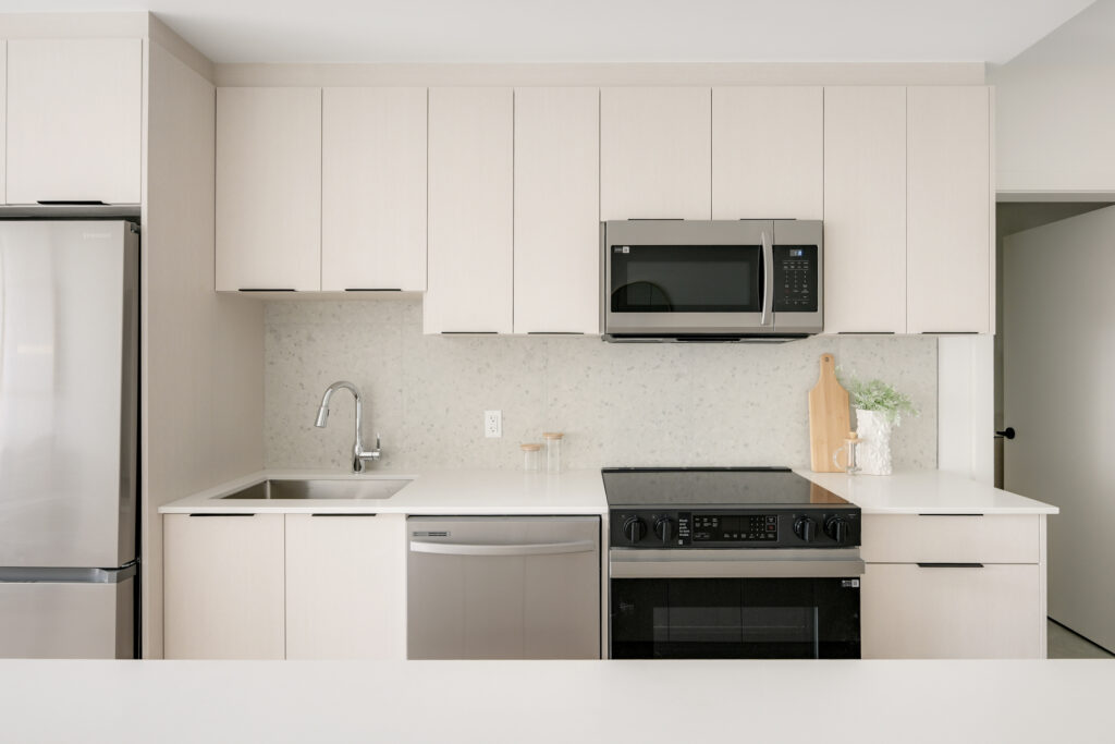 The open-concept layout and sophisticated interior seamlessly integrates modern, stylish features, providing a versatile and spacious environment that adapts to your lifestyle. Expansive windows frame breathtaking ocean views, filling each room with natural light and highlighting the sophisticated design and high-quality finishes throughout. As such, each suite offers sleek kitchens with quartz countertops, Terrazzo tile backsplash, modern white cabinetry with soft-close hardware and stainless-steel appliance packages. All available suites also include high-end features such in-suite laundry, air conditioning, spacious balconies, and more.