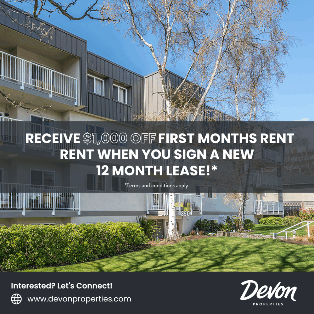 *Terms and conditions apply. To be eligible, you must be a new resident and sign a lease for the specified lease term. The offer is not applicable for those who transfer within the Devon Properties portfolio. This is a one-time offer and may be withdrawn or extended at any time by Devon Properties Ltd. Offers, benefits and services are subject to change and are not an essential, required, or ancillary service provided by the landlord.