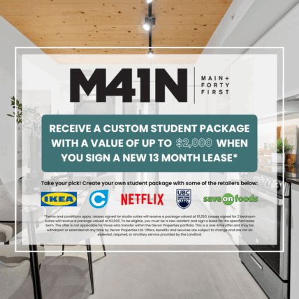 *Terms and conditions apply. To be eligible, you must be a new resident and sign a lease for the specified lease term. The offer is not applicable for those who transfer within the Devon Properties portfolio. This is a one-time offer and may be withdrawn or extended at any time by Devon Properties Ltd. Offers, benefits and services are subject to change and are not an essential, required, or ancillary service provided by the landlord.