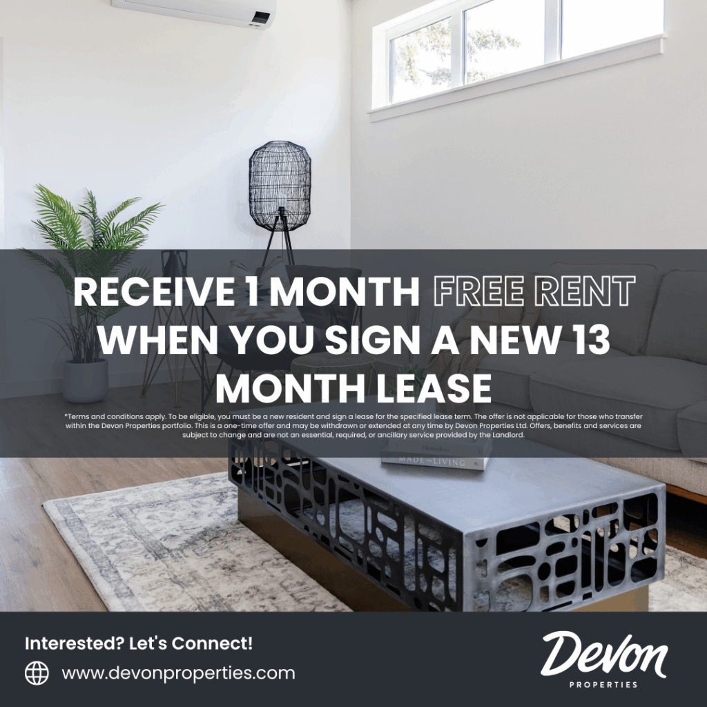 *Terms and conditions apply. To be eligible, you must be a new resident and sign a lease for the specified lease term. The offer is not applicable for those who transfer within the Devon Properties portfolio. This is a one-time offer and may be withdrawn or extended at any time by Devon Properties Ltd. Offers, benefits and services are subject to change and are not an essential, required, or ancillary service provided by the landlord.