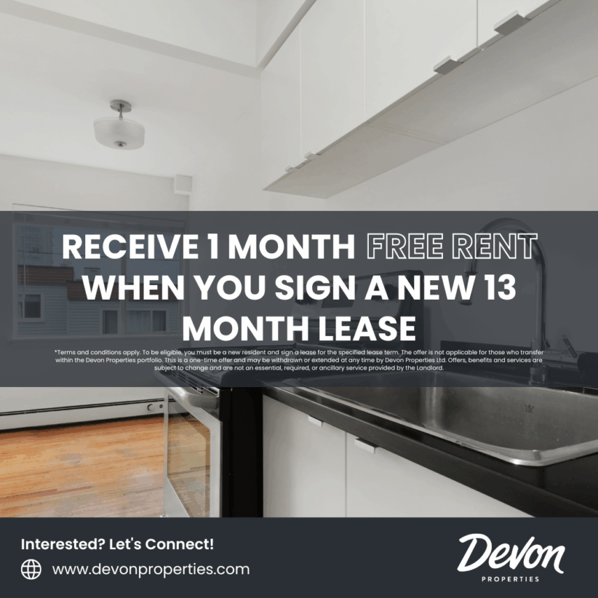 *Terms and conditions apply. To be eligible, you must be a new resident and sign a lease for the specified lease term. The offer is not applicable for those who transfer within the Devon Properties portfolio. This is a one-time offer and may be withdrawn or extended at any time by Devon Properties Ltd. Offers, benefits and services are subject to change and are not an essential, required, or ancillary service provided by the landlord.