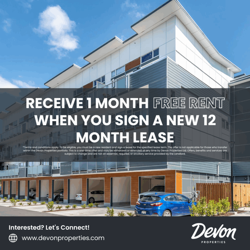 *Terms and conditions apply. To be eligible, you must be a new resident and sign a lease for the specified lease term. The offer is not applicable for those who transfer within the Devon Properties portfolio. This is a one-time offer and may be withdrawn or extended at any time by Devon Properties Ltd. Offers, benefits and services are subject to change and are not an essential, required, or ancillary service provided by the landlord.