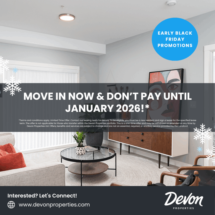 *Terms and conditions apply. To be eligible, you must be a new resident and sign a lease for the specified lease term. The offer is not applicable for those who transfer within the Devon Properties portfolio. This is a one-time offer and may be withdrawn or extended at any time by Devon Properties Ltd. Offers, benefits and services are subject to change and are not an essential, required, or ancillary service provided by the landlord.