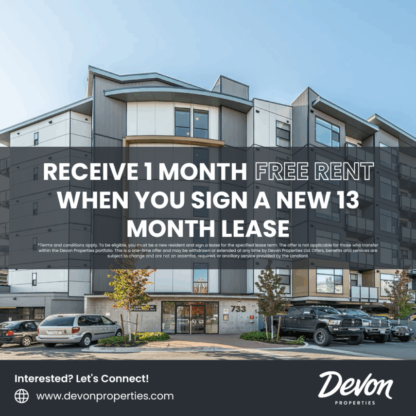 *Terms and conditions apply. To be eligible, you must be a new resident and sign a lease for the specified lease term. The offer is not applicable for those who transfer within the Devon Properties portfolio. This is a one-time offer and may be withdrawn or extended at any time by Devon Properties Ltd. Offers, benefits and services are subject to change and are not an essential, required, or ancillary service provided by the landlord.