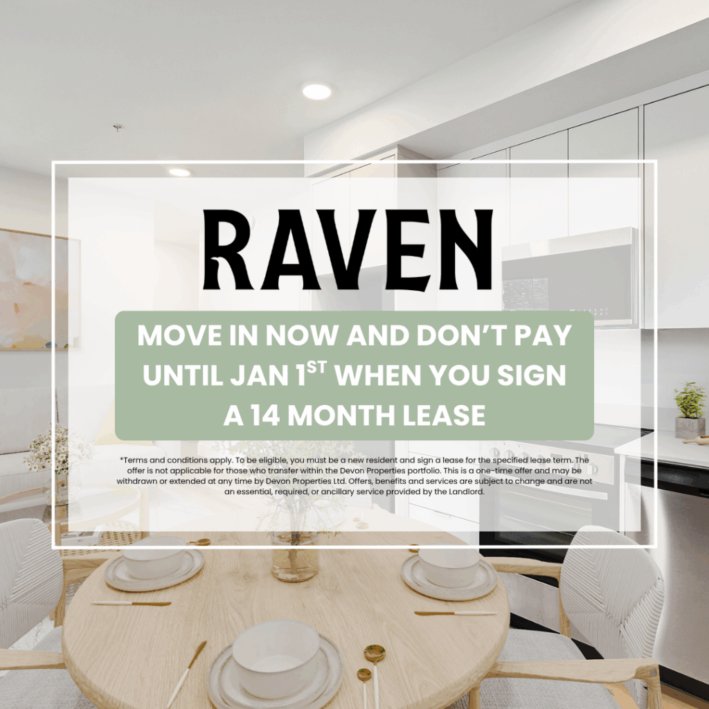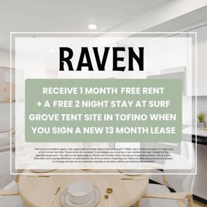 *Terms and conditions apply. To be eligible, you must be a new resident and sign a lease for the specified lease term. The offer is not applicable for those who transfer within the Devon Properties portfolio. This is a one-time offer and may be withdrawn or extended at any time by Devon Properties Ltd. Offers, benefits and services are subject to change and are not an essential, required, or ancillary service provided by the landlord.