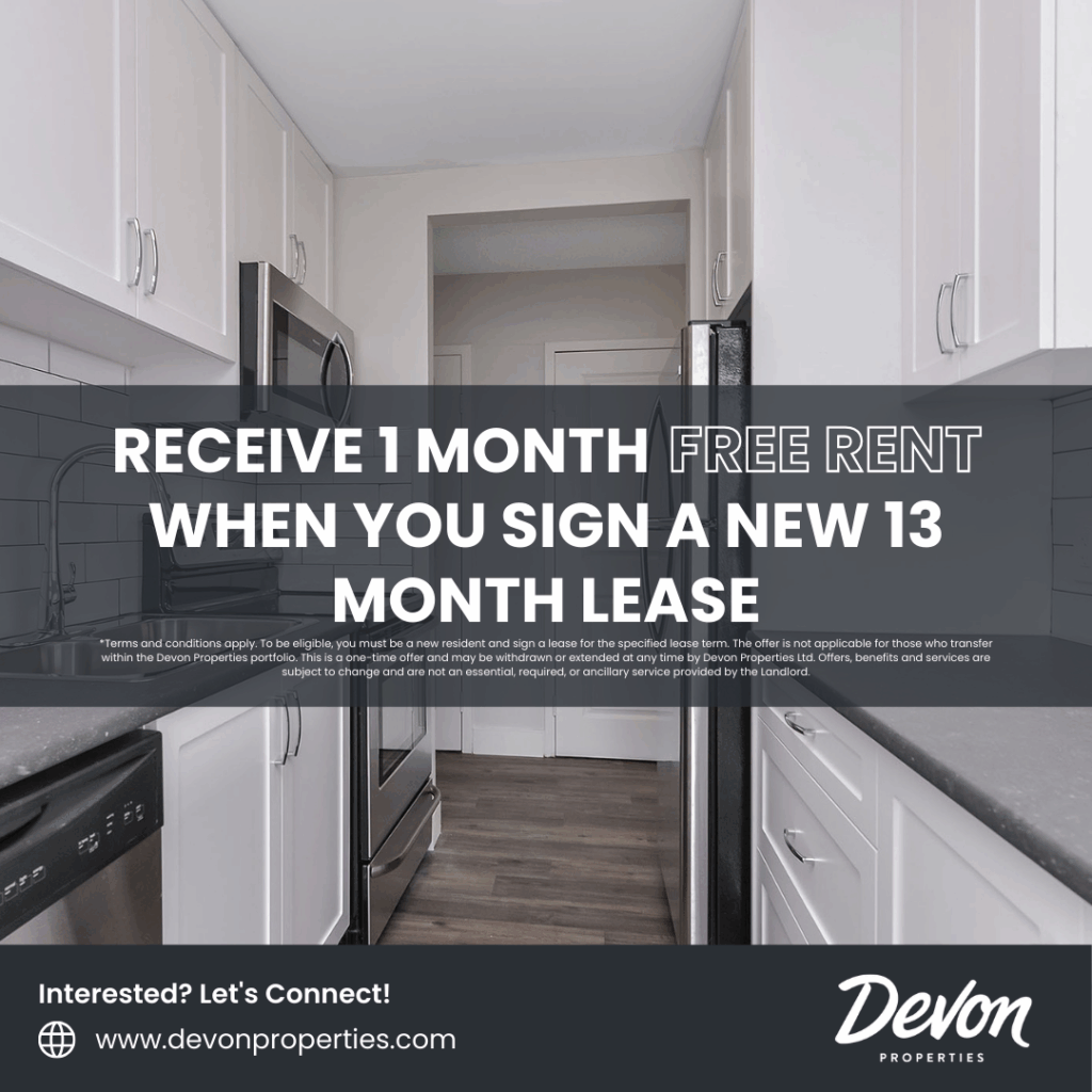 *Terms and conditions apply. To be eligible, you must be a new resident and sign a lease for the specified lease term. The offer is not applicable for those who transfer within the Devon Properties portfolio. This is a one-time offer and may be withdrawn or extended at any time by Devon Properties Ltd. Offers, benefits and services are subject to change and are not an essential, required, or ancillary service provided by the landlord.