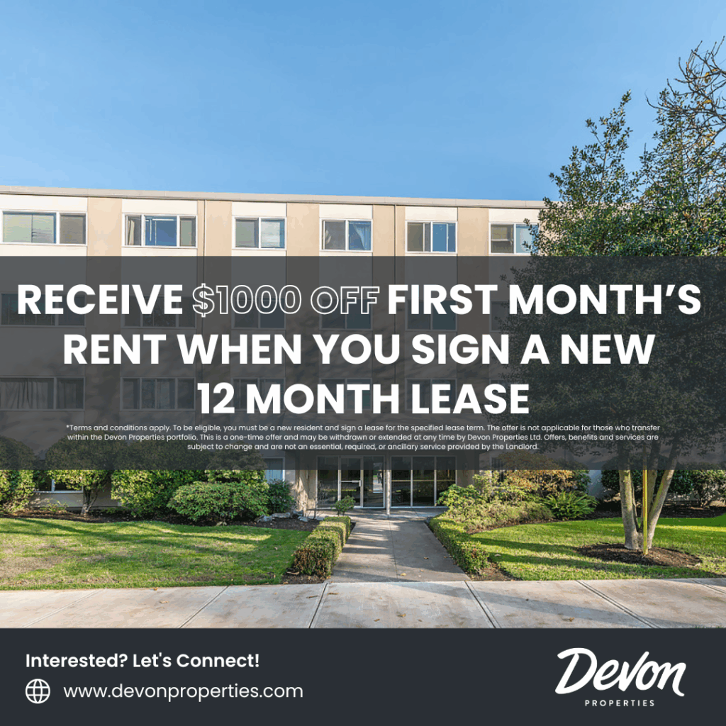 *Terms and conditions apply. To be eligible, you must be a new resident and sign a lease for the specified lease term. The offer is not applicable for those who transfer within the Devon Properties portfolio. This is a one-time offer and may be withdrawn or extended at any time by Devon Properties Ltd. Offers, benefits and services are subject to change and are not an essential, required, or ancillary service provided by the landlord.