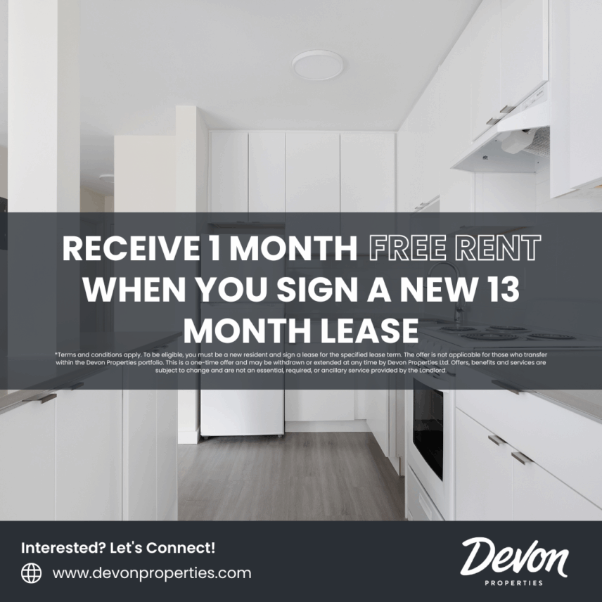 *Terms and conditions apply. To be eligible, you must be a new resident and sign a lease for the specified lease term. The offer is not applicable for those who transfer within the Devon Properties portfolio. This is a one-time offer and may be withdrawn or extended at any time by Devon Properties Ltd. Offers, benefits and services are subject to change and are not an essential, required, or ancillary service provided by the landlord.