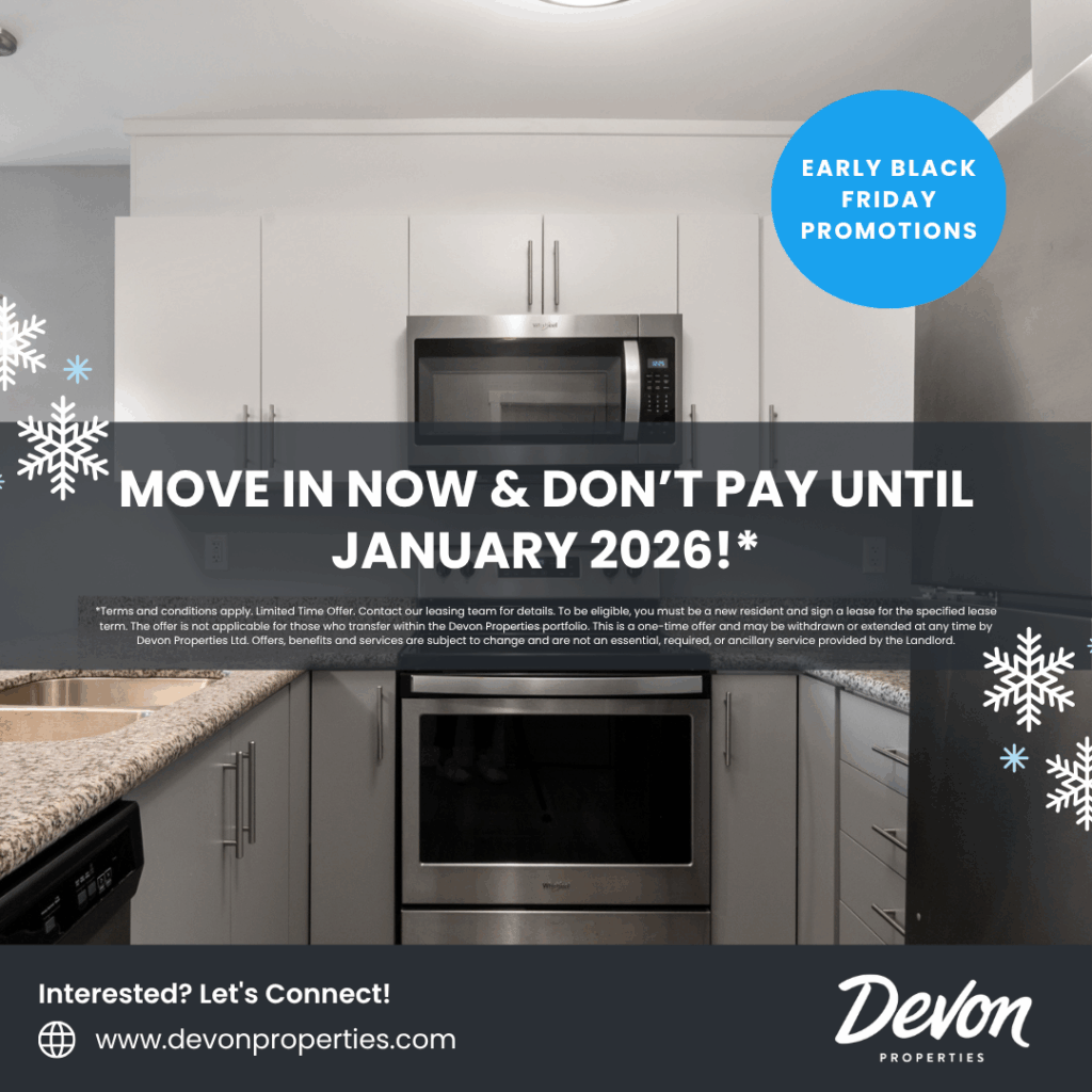 *Terms and conditions apply. To be eligible, you must be a new resident and sign a lease for the specified lease term. The offer is not applicable for those who transfer within the Devon Properties portfolio. This is a one-time offer and may be withdrawn or extended at any time by Devon Properties Ltd. Offers, benefits and services are subject to change and are not an essential, required, or ancillary service provided by the landlord.