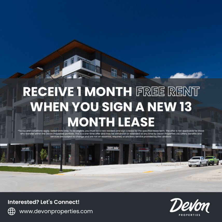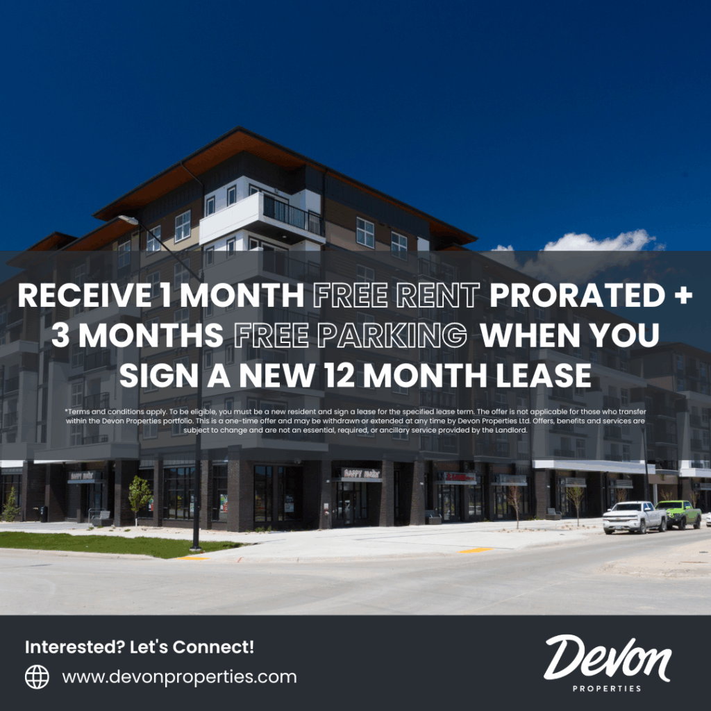 *Terms and conditions apply. To be eligible, you must be a new resident and sign a lease for the specified lease term. The offer is not applicable for those who transfer within the Devon Properties portfolio. This is a one-time offer and may be withdrawn or extended at any time by Devon Properties Ltd. Offers, benefits and services are subject to change and are not an essential, required, or ancillary service provided by the landlord.