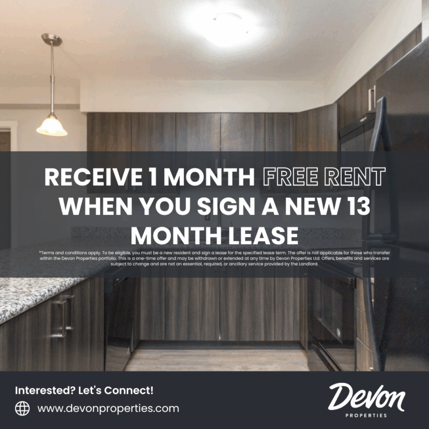 *Terms and conditions apply. To be eligible, you must be a new resident and sign a lease for the specified lease term. The offer is not applicable for those who transfer within the Devon Properties portfolio. This is a one-time offer and may be withdrawn or extended at any time by Devon Properties Ltd. Offers, benefits and services are subject to change and are not an essential, required, or ancillary service provided by the landlord.