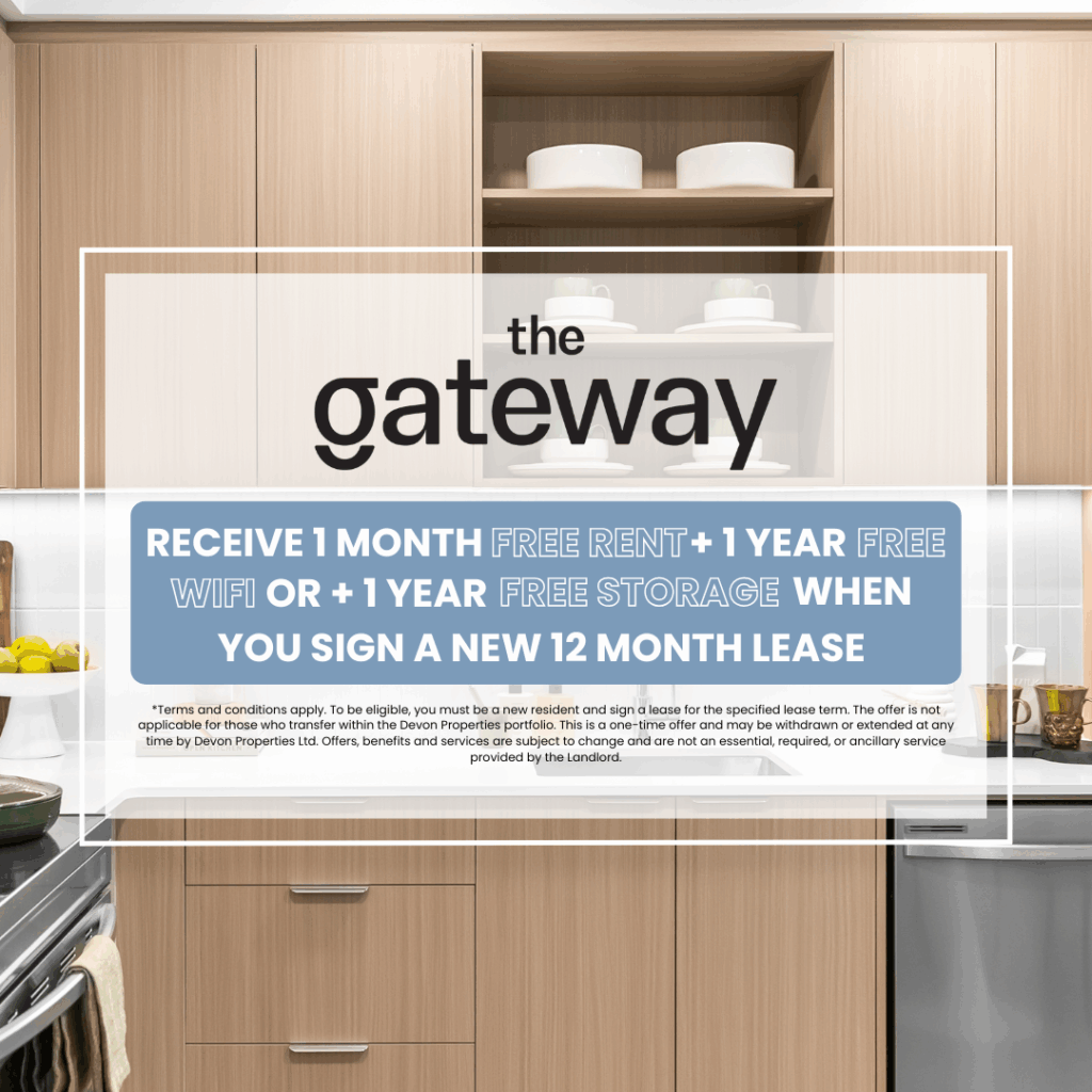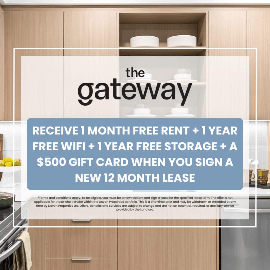 *Terms and conditions apply. To be eligible, you must be a new resident and sign a lease for the specified lease term. The offer is not applicable for those who transfer within the Devon Properties portfolio. This is a one-time offer and may be withdrawn or extended at any time by Devon Properties Ltd. Offers, benefits and services are subject to change and are not an essential, required, or ancillary service provided by the landlord.