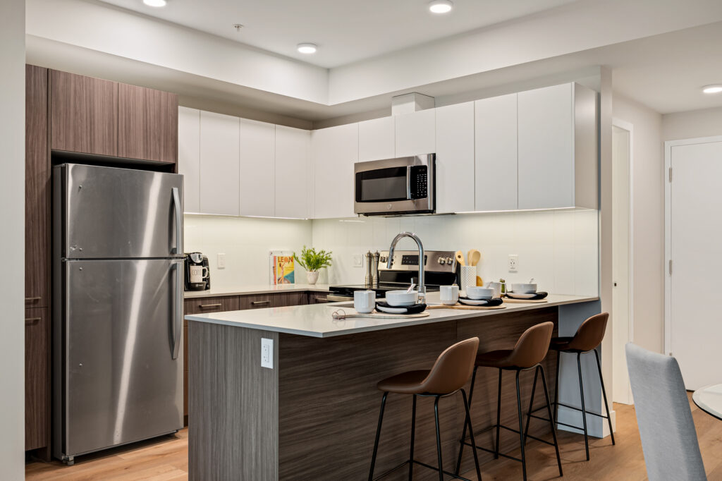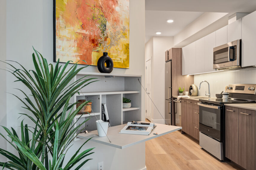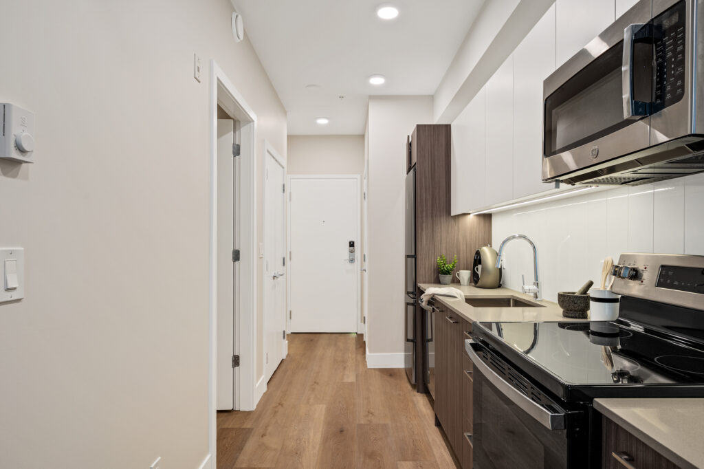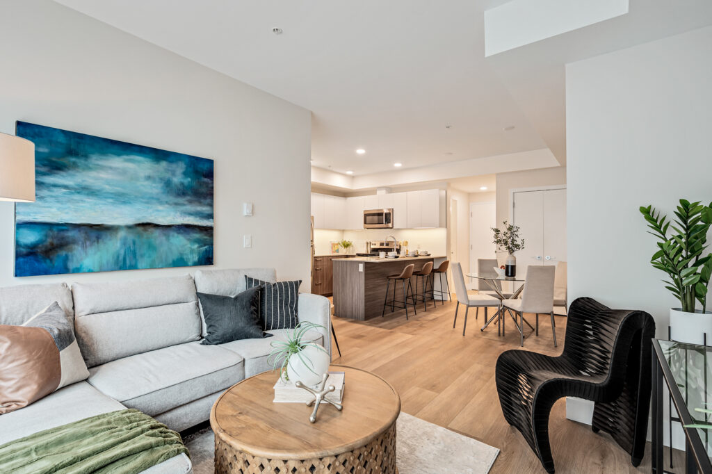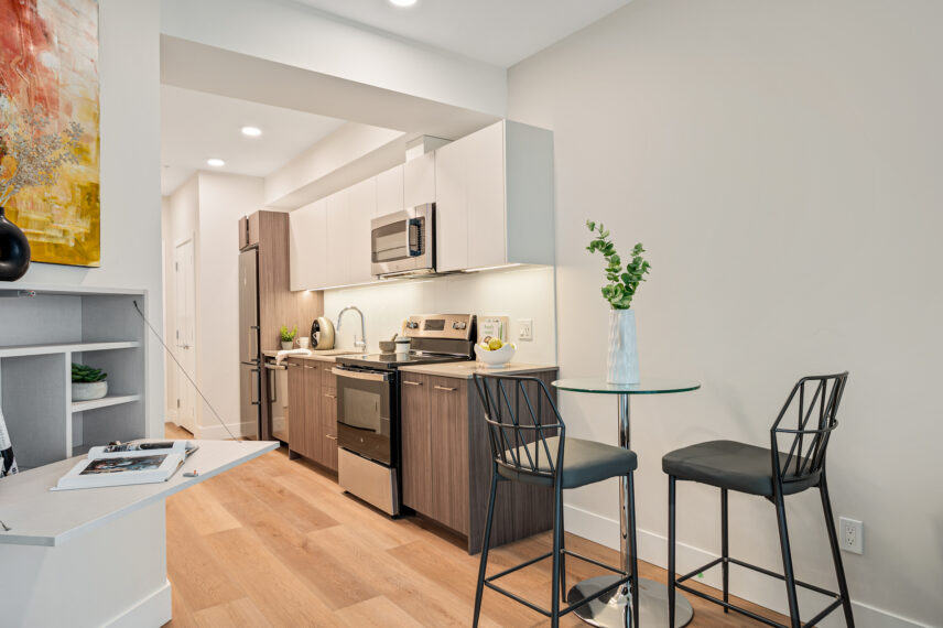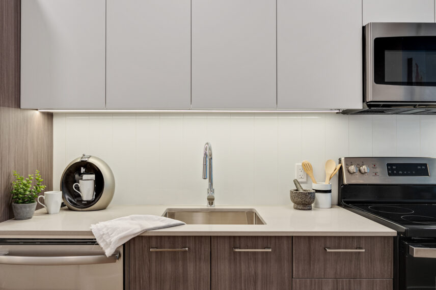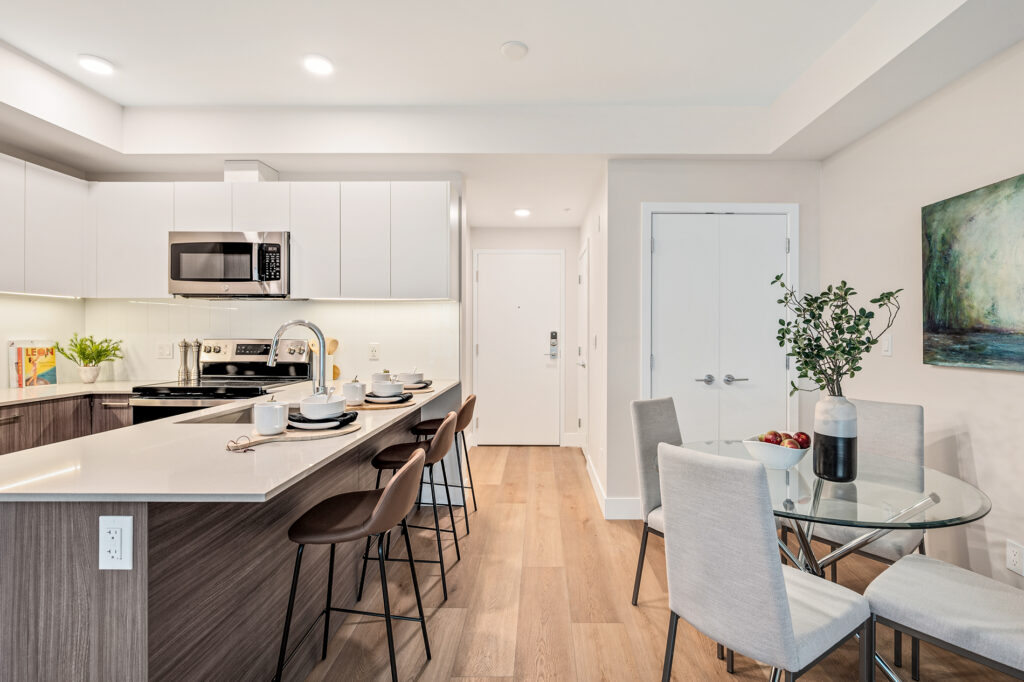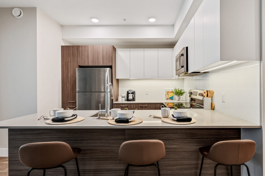 Each home has been thoughtfully considered and well-built for daily life, offering sleek kitchens with quartz countertops, premium finishes, and modern white cabinetry. Each unit also includes high-end suite features such as stainless steel appliance packages, in-suite laundry, spacious balconies, and more.