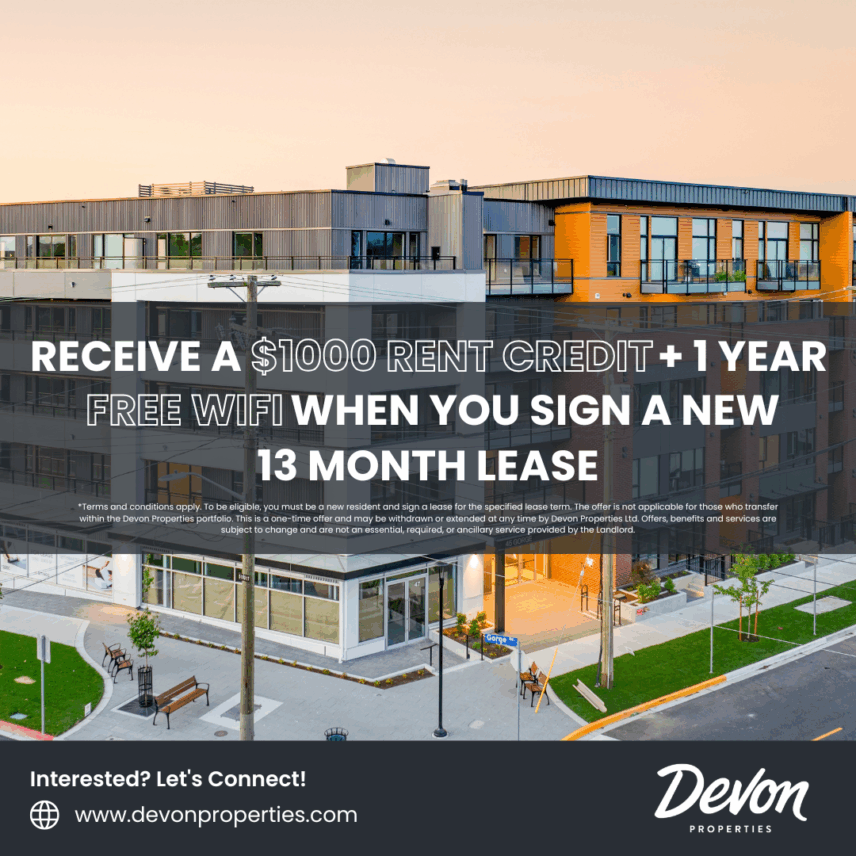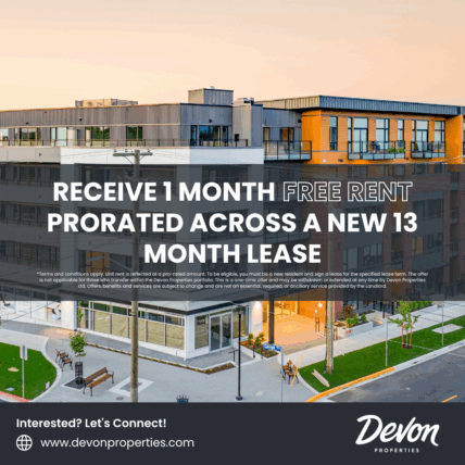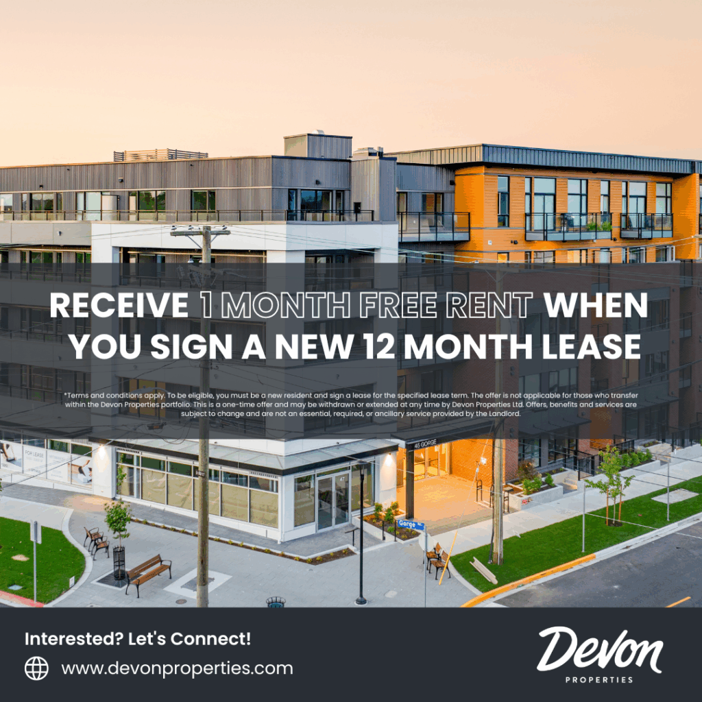 *Terms and conditions apply. To be eligible, you must be a new resident and sign a lease for the specified lease term. The offer is not applicable for those who transfer within the Devon Properties portfolio. This is a one-time offer and may be withdrawn or extended at any time by Devon Properties Ltd. Offers, benefits and services are subject to change and are not an essential, required, or ancillary service provided by the landlord.