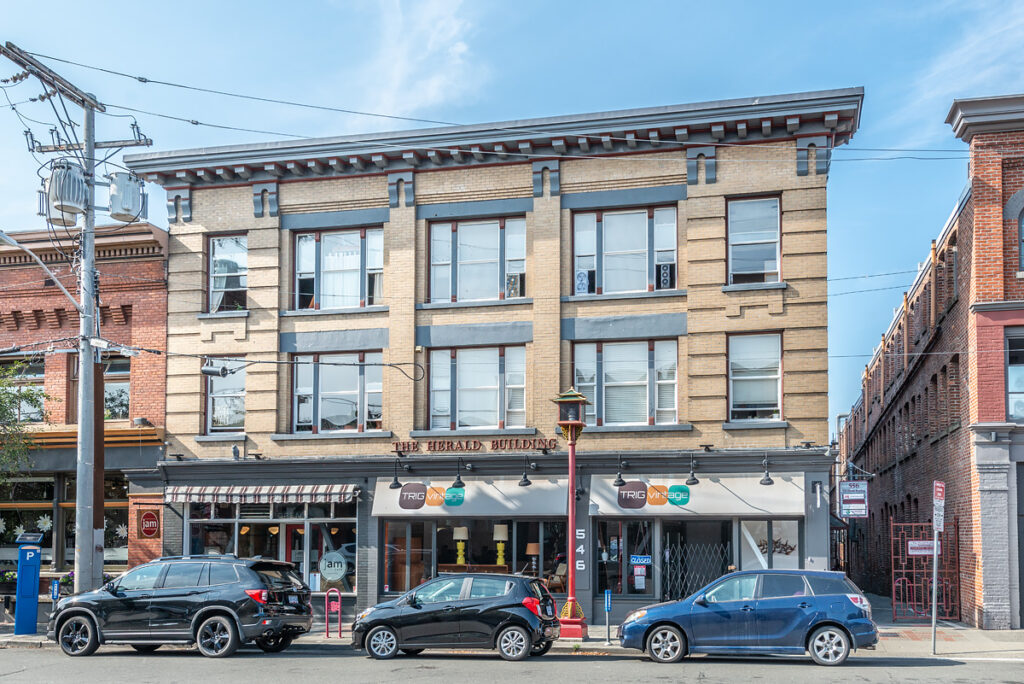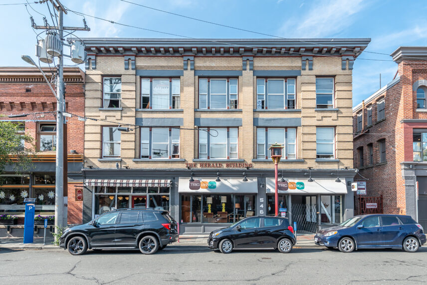 The Herald Building Apartments is a three-storey heritage building comprised of 3850 sq ft of commercial space on the ground floor and 17 bachelor residential suites on the walk-up upper floors. This property is conveniently located at 556 Herald Street, in the heart of Downtown Victoria, only steps from retail and restaurants, the Inner Harbour and Victoria’s Chinatown. All available units offer uniquely renovated suites, featuring stainless steel appliances, exposed brick walls, hardwood floors, and spacious layouts.