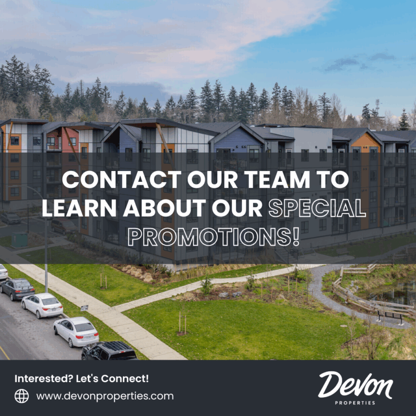*Terms and conditions apply. To be eligible, you must be a new resident and sign a lease for the specified lease term. The offer is not applicable for those who transfer within the Devon Properties portfolio. This is a one-time offer and may be withdrawn or extended at any time by Devon Properties Ltd. Offers, benefits and services are subject to change and are not an essential, required, or ancillary service provided by the landlord.