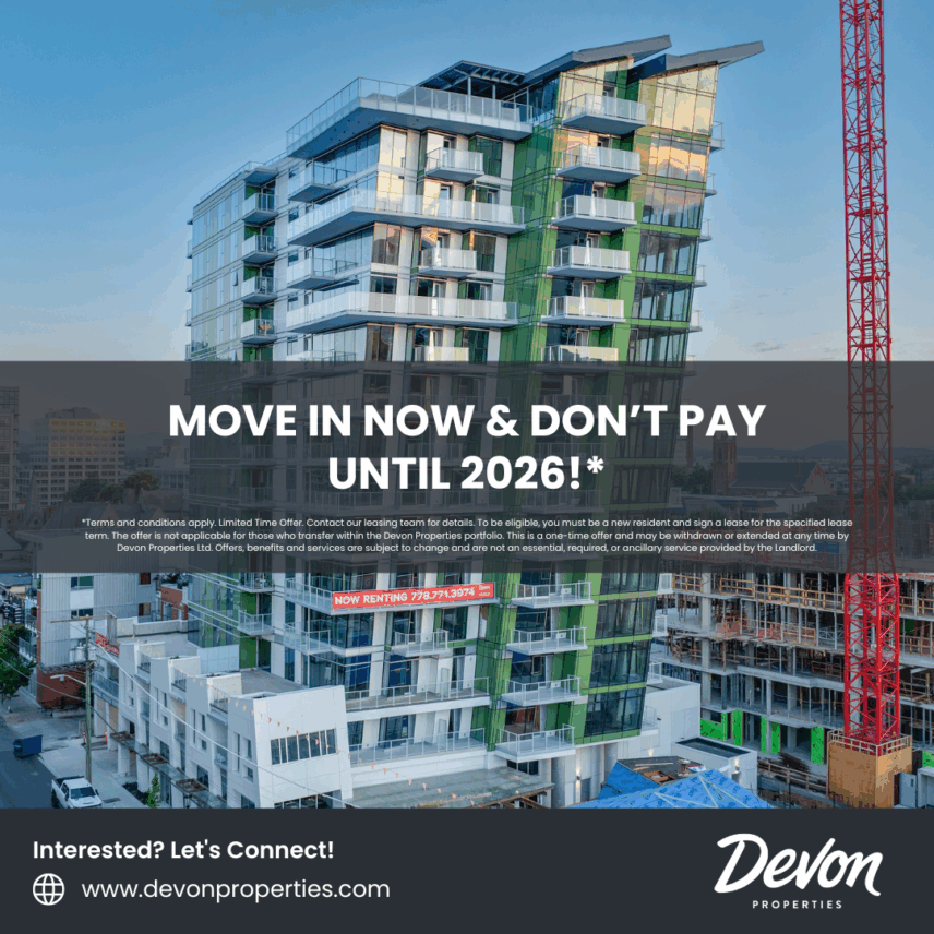 *Terms and conditions apply. To be eligible, you must be a new resident and sign a lease for the specified lease term. The offer is not applicable for those who transfer within the Devon Properties portfolio. This is a one-time offer and may be withdrawn or extended at any time by Devon Properties Ltd. Offers, benefits and services are subject to change and are not an essential, required, or ancillary service provided by the landlord.