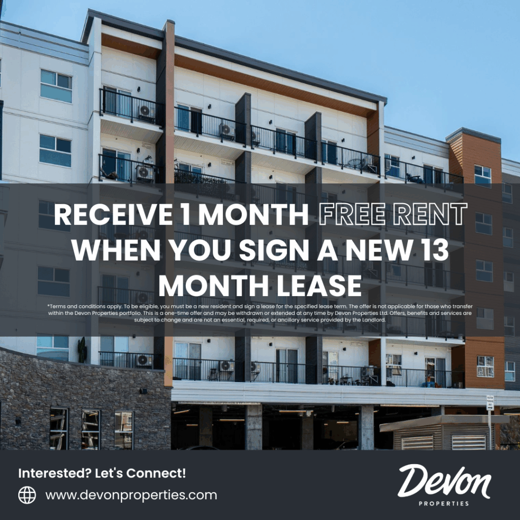 *Terms and conditions apply. To be eligible, you must be a new resident and sign a lease for the specified lease term. The offer is not applicable for those who transfer within the Devon Properties portfolio. This is a one-time offer and may be withdrawn or extended at any time by Devon Properties Ltd. Offers, benefits and services are subject to change and are not an essential, required, or ancillary service provided by the landlord.
