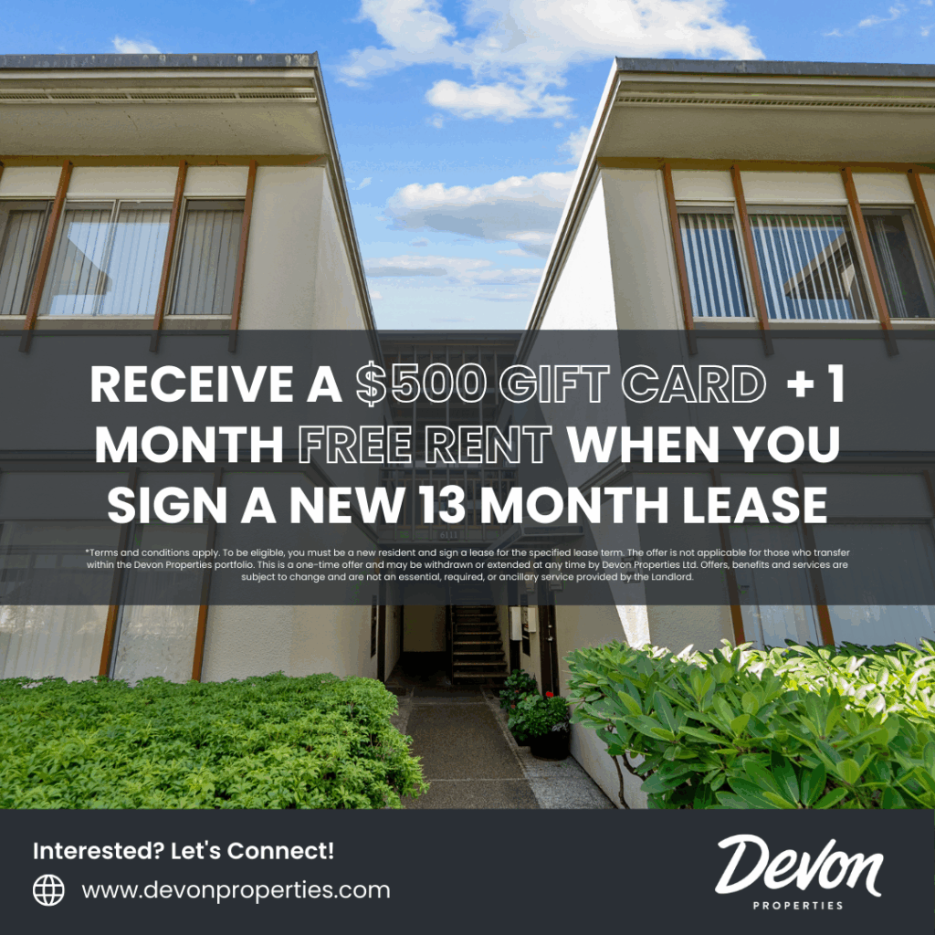 *Terms and conditions apply. To be eligible, you must be a new resident and sign a lease for the specified lease term. The offer is not applicable for those who transfer within the Devon Properties portfolio. This is a one-time offer and may be withdrawn or extended at any time by Devon Properties Ltd. Offers, benefits and services are subject to change and are not an essential, required, or ancillary service provided by the landlord.