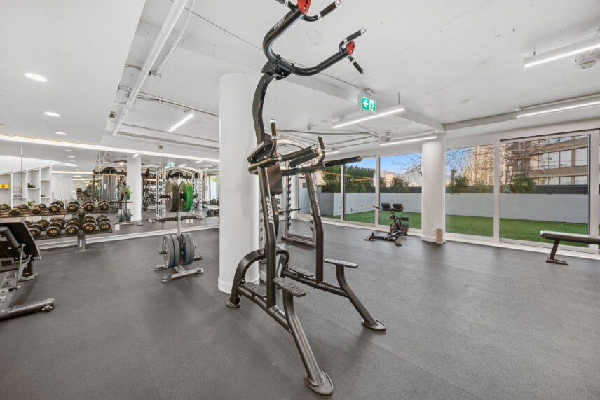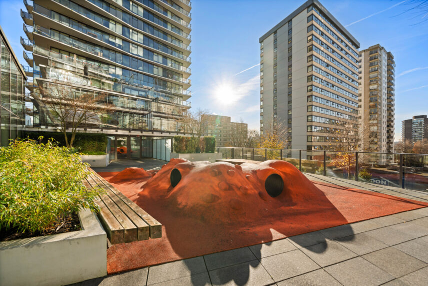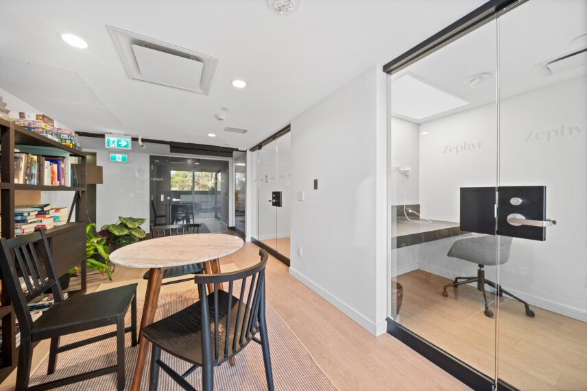 Zephyr Apartments offers exceptional amenities, including a two-level fitness facility with an outdoor workout space, a Cycle Club bikeshare program, a rooftop lounge with BBQs, a library, a children’s play area, and a secured gated parkade with EV charging stations.