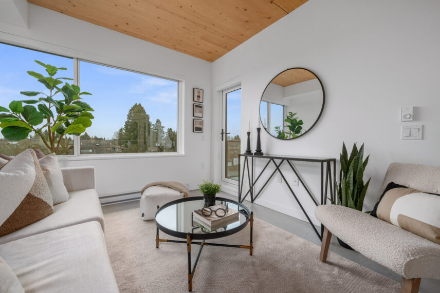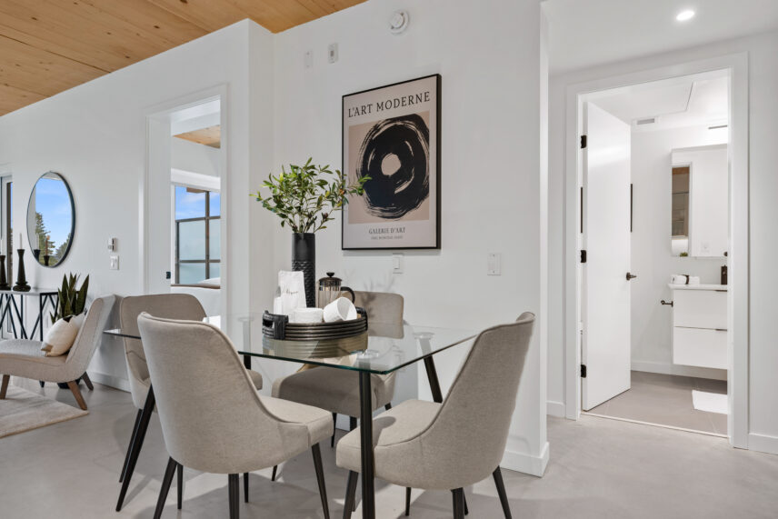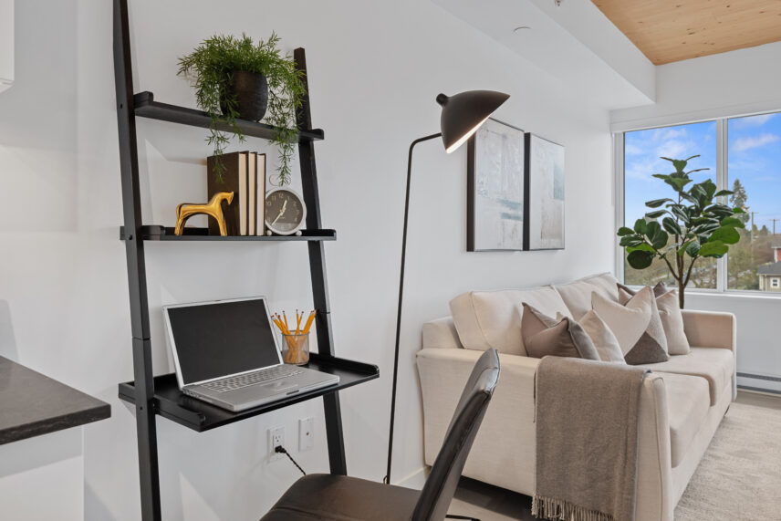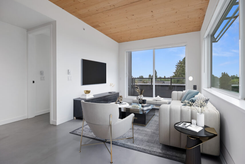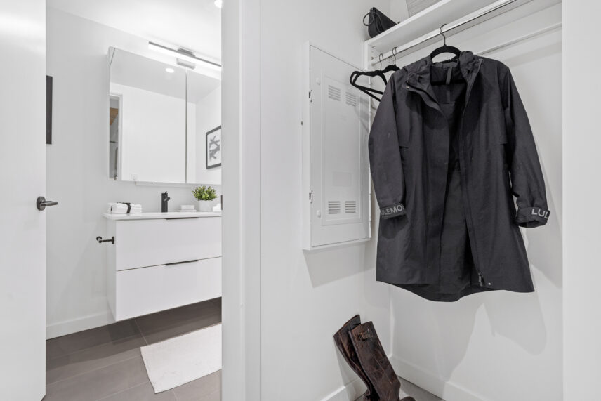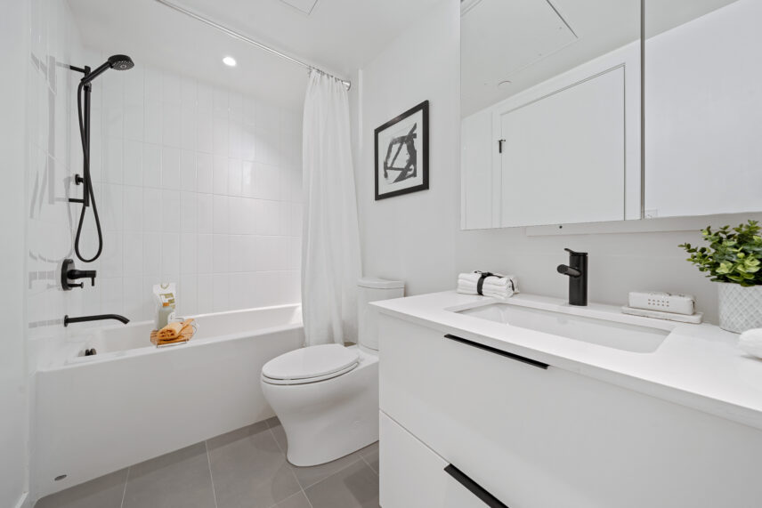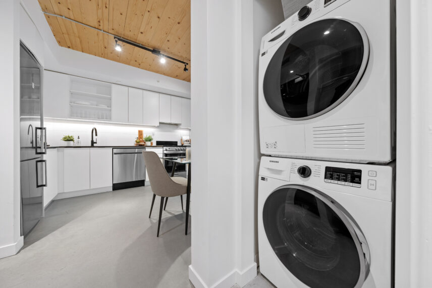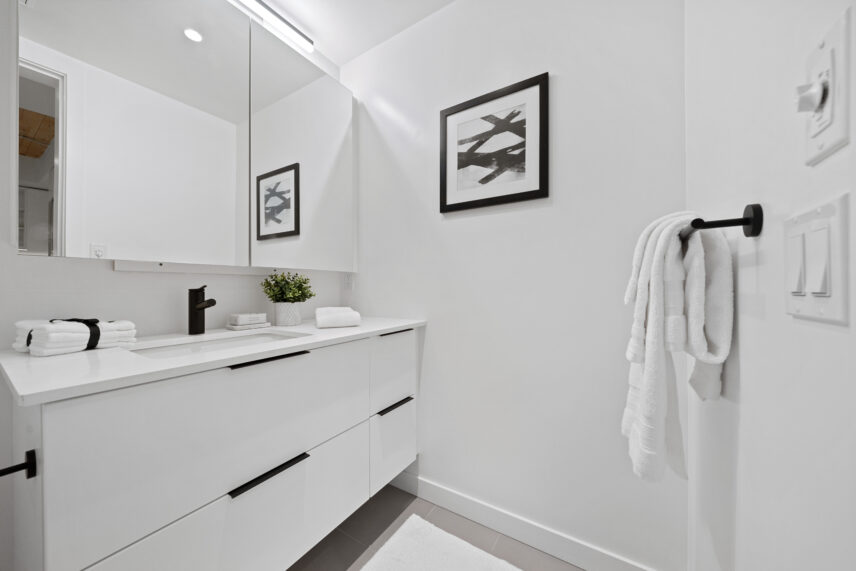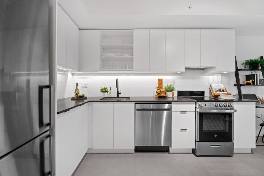 Each suite offers modern kitchens with ample storage, beautiful clean line white cabinetry with matte black accents and fixtures, as well as new high-end appliances such as dishwashers and washers and dryers in every unit. Residents can take advantage of amenities including the expansive rooftop patio to enjoy and entertain friends and family with view of the North Shore Mountains, secure storage, and underground parking.