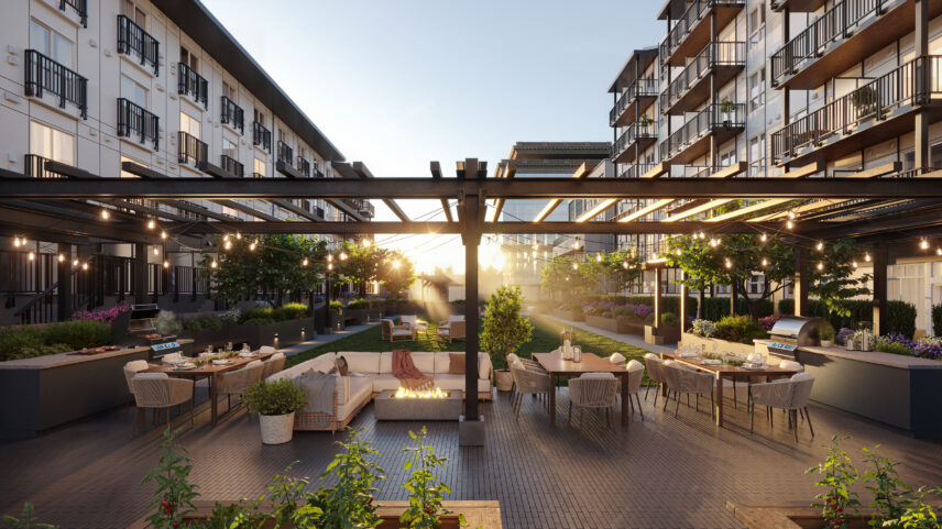 Resident amenities extend daily living beyond your apartment, including a social lounge, flexible co-working spaces, a fitness centre, and a landscaped courtyard designed for outdoor gathering and relaxation. Pet-focused amenities include a dedicated dog run and dog wash incorporated into the building.