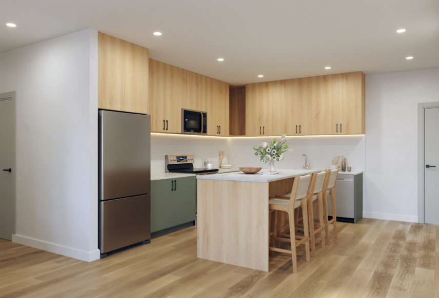 Inside the suites, residents will find thoughtfully designed homes that balance modern comfort with coastal sophistication. Contemporary kitchens feature stainless steel appliances, including dishwashers, paired with clean-lined cabinetry and durable finishes suited to everyday living. In-suite washer and dryer offer added convenience, while beautiful hardwood flooring, pristine bathrooms, and light-filled living spaces create an elevated yet welcoming atmosphere. Pet-friendly by design, the suites are crafted to feel both refined and relaxed – an ideal expression of modern rental living in a community as distinctive as Sechelt.