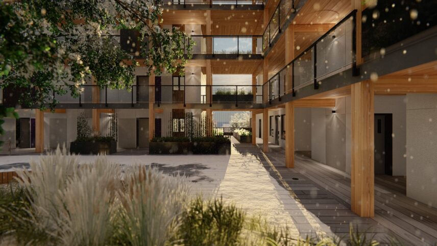 The building’s contemporary design is organized around a landscaped central courtyard, bringing natural light and creating shared outdoor space for residents. Building amenities and features include elevator access to all residential floors, secure bicycle storage, EV-ready parking, and thoughtfully designed indoor and outdoor common areas. Street-level retail and commercial space activates the ground floor and strengthens the connection to the surrounding downtown neighbourhood.