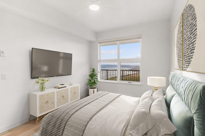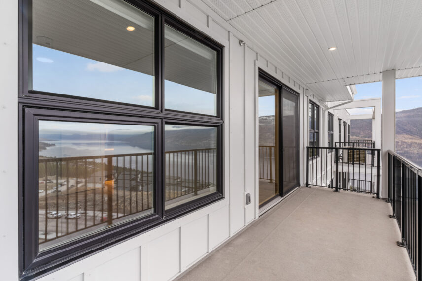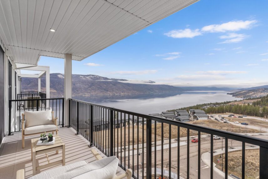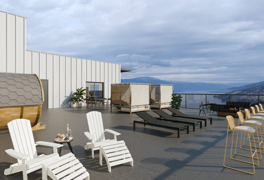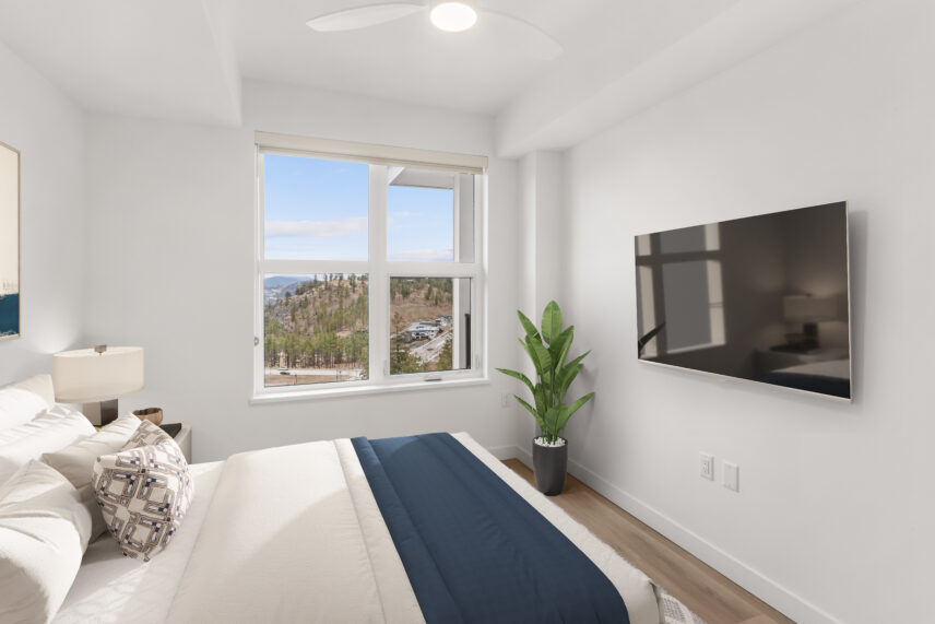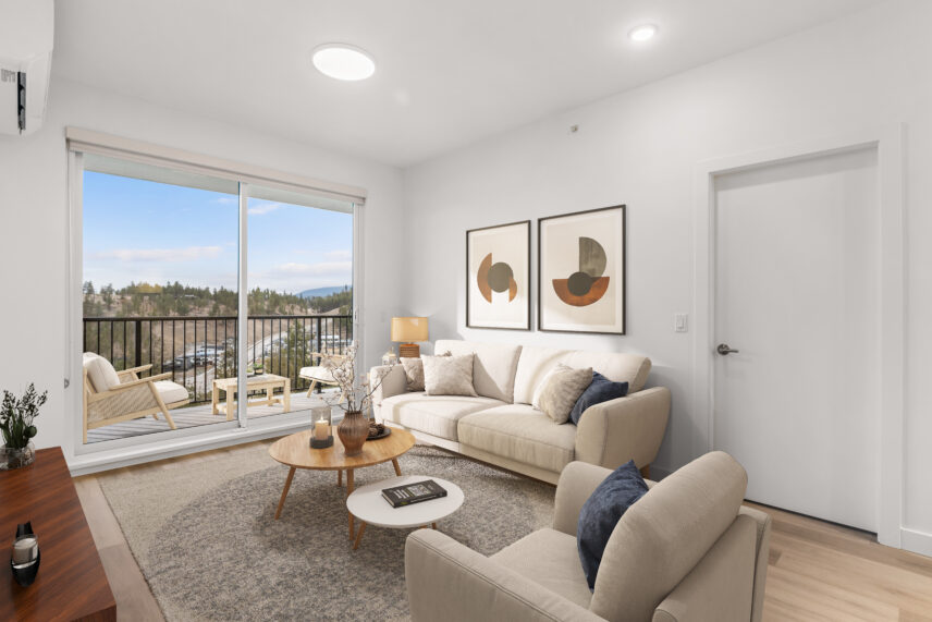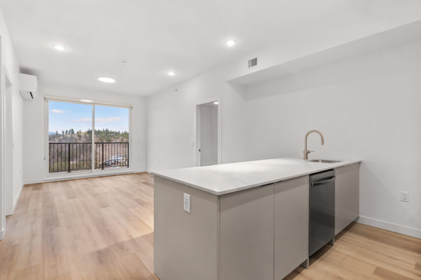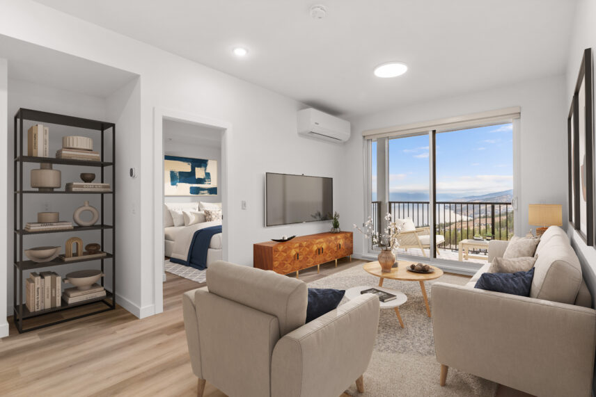 The development includes 164 purpose-built rental apartments, offering a mix of one-, two-, and three-bedroom homes designed to balance contemporary comfort with lakeside living. Every suite features a private balcony, many with views of Okanagan Lake, the surrounding hillsides, or the community’s landscaped grounds, allowing natural light and scenery to become part of everyday living.