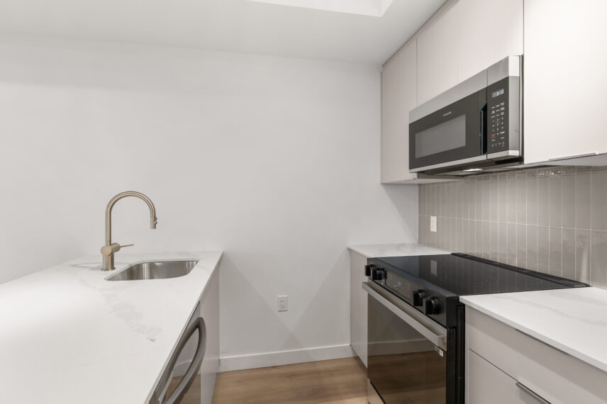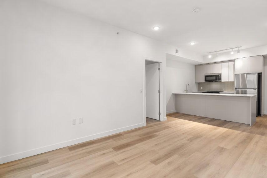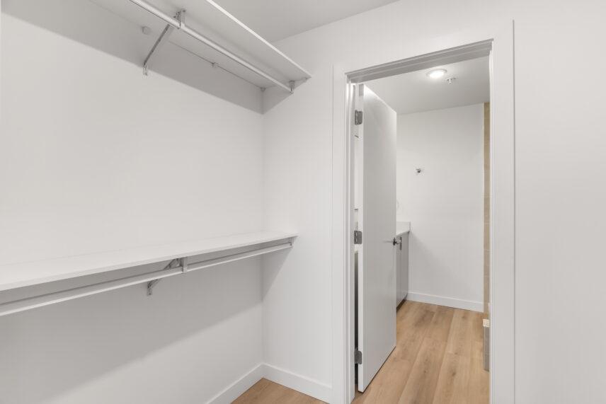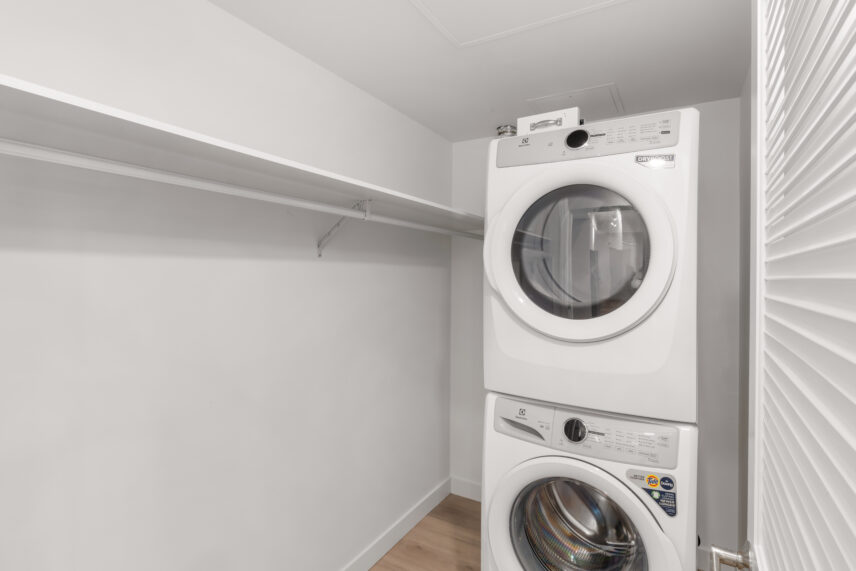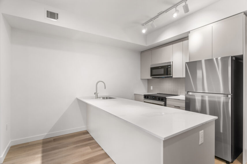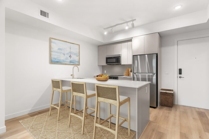 Inside the suites, interiors are calm, modern, and refined, drawing inspiration from the lakefront setting. High-quality flooring is paired with soft, neutral wall tones to create bright, light-filled living spaces. Kitchens feature contemporary cabinetry, elegant quartz-style countertops, and a full stainless steel appliance package, including a dishwasher, designed to support both everyday living and entertaining. In-suite washer and dryer are discreetly integrated for added convenience. Bathrooms are finished with clean-lined fixtures, stylish tile surrounds, and thoughtful lighting, creating spa-like spaces that feel both functional and elevated.